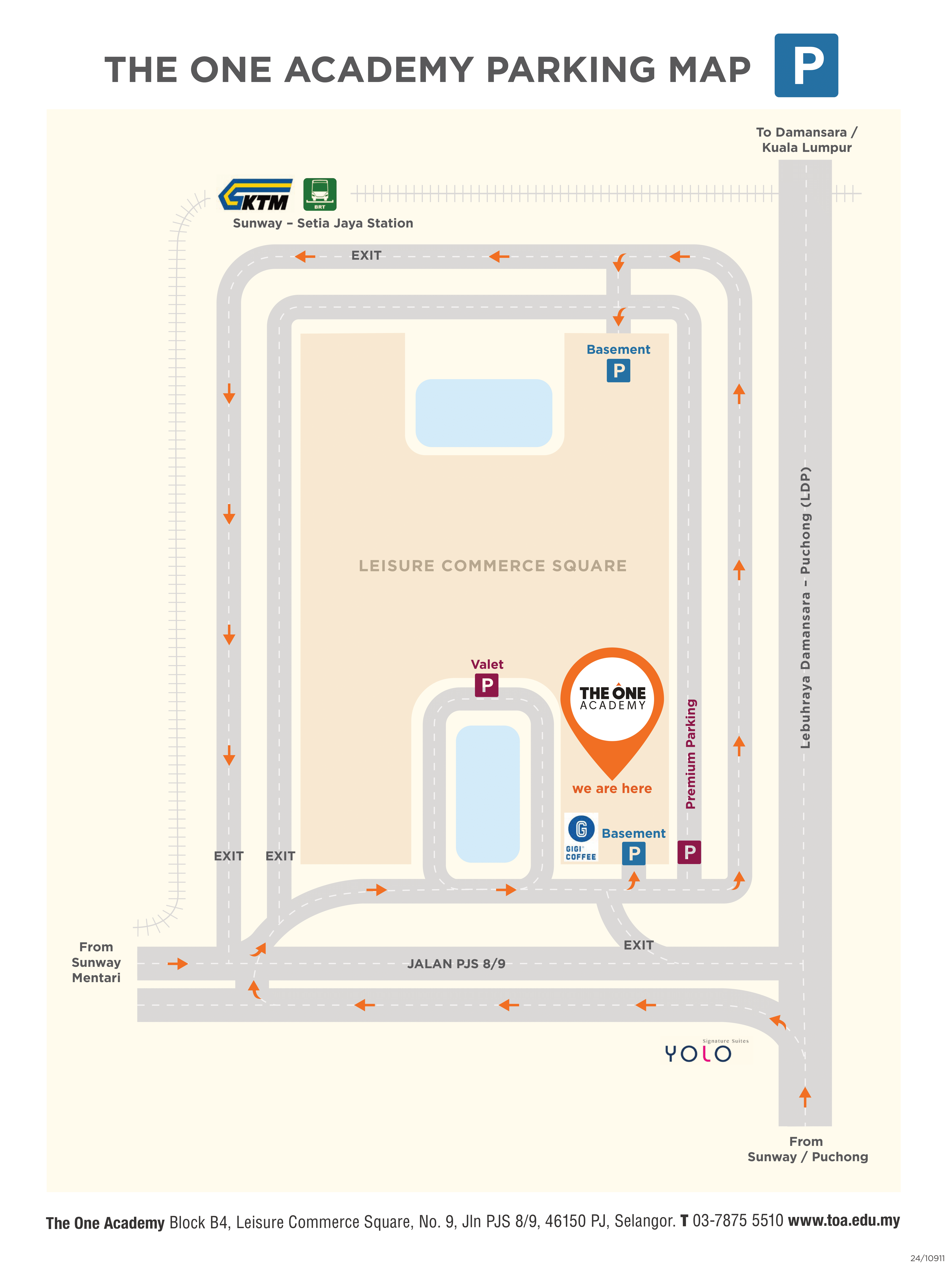 The One Academy is located in Leisure Commerce Square, Petaling Jaya which is easily accessed through the Federal, KESAS, LDP and NPE highways. Our main entrance is opposite the 7-Eleven convenience store located in the vicinity of the building.
